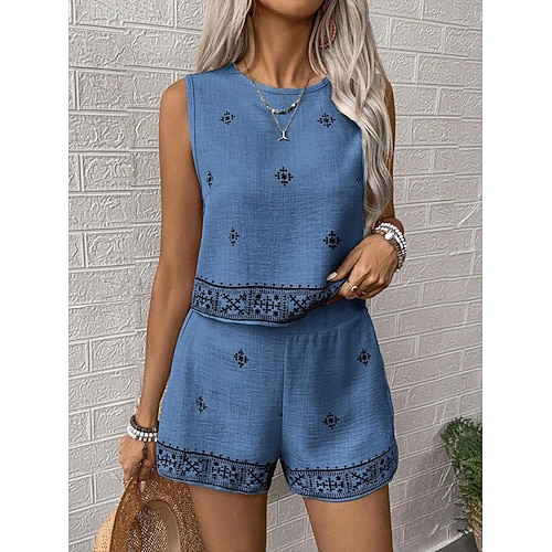 Completi di Pantaloni Corti in Lino Falso per Donna Set senza Maniche Collo Rotondo Stampa Geometrica Elegante Moda Streetwear Casual Giornalieri all'Aperto Blu Verde Khaki Estate Vestibilità Regolare