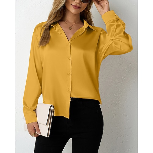 Per donna Camicia Elegant Elegante Raso/Satin Tinta unica Elegante Essenziale Casual Manica Lunga Colletto a Camicia Top Regolari Quotidiano Uscire Bottoni Bianco Giallo Blu Reale Viola chiaro Marrone