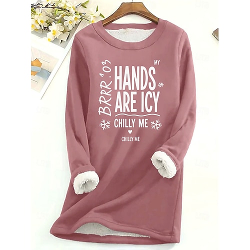 felpa da donna con fodera in pile, pigiama, pullover, sì, ho freddo, lettera, streetwear, casual, manica lunga, girocollo, top normali, street, vacanza, tasca, stampa, nero, rosa, blu, grigio chiaro