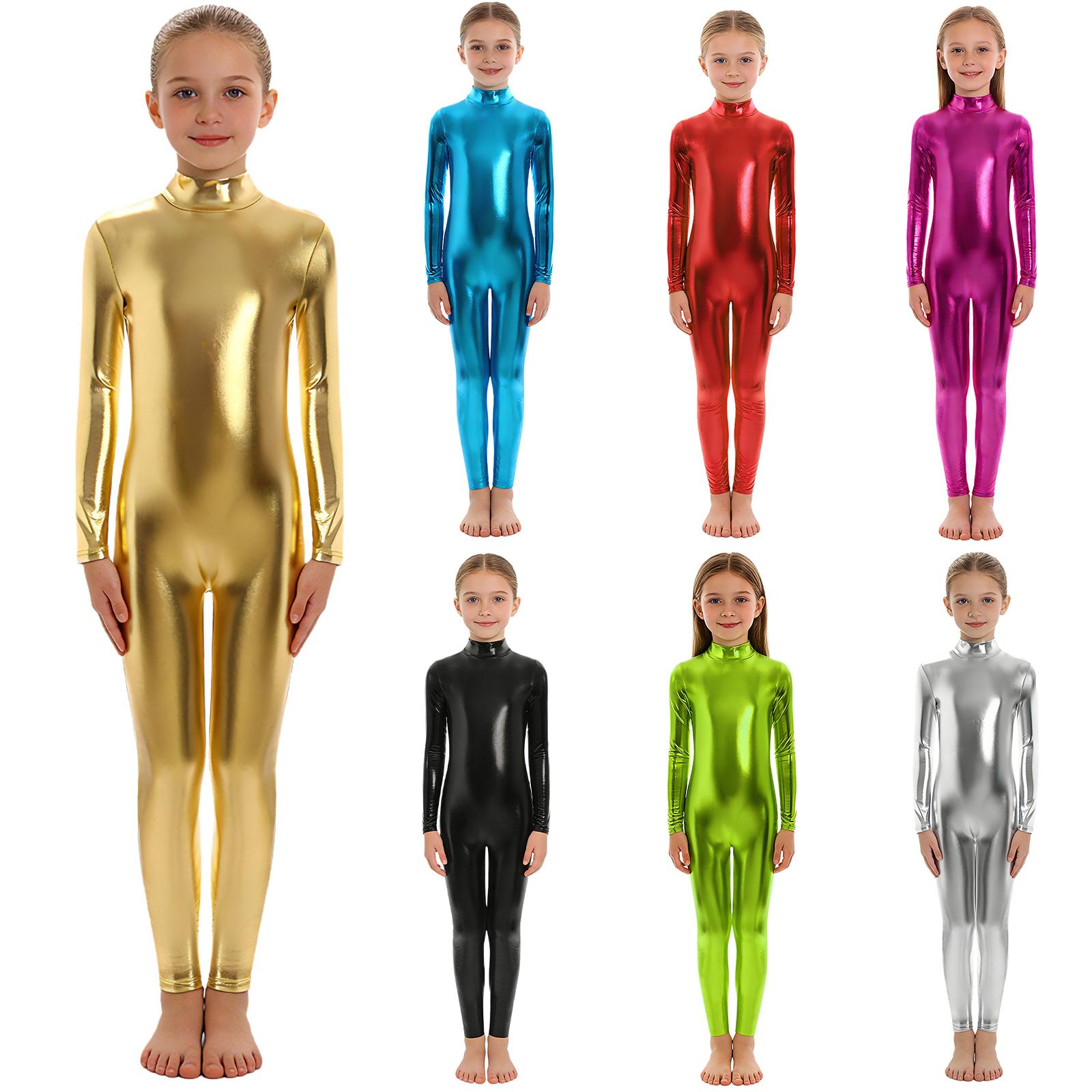 Unisex Kids Metallic Jumpsuit Halloween Costume, Mock Neck Long Sleeve Full Length Leotard for Role Play & Dance Performance cm hot pink
