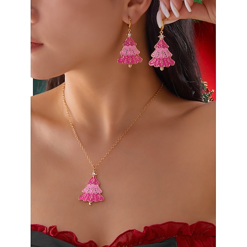 set di gioielli da donna a forma di albero di Natale rosa, collana e orecchini in smalto color oro, accessorio festivo per feste invernali, regali abiti