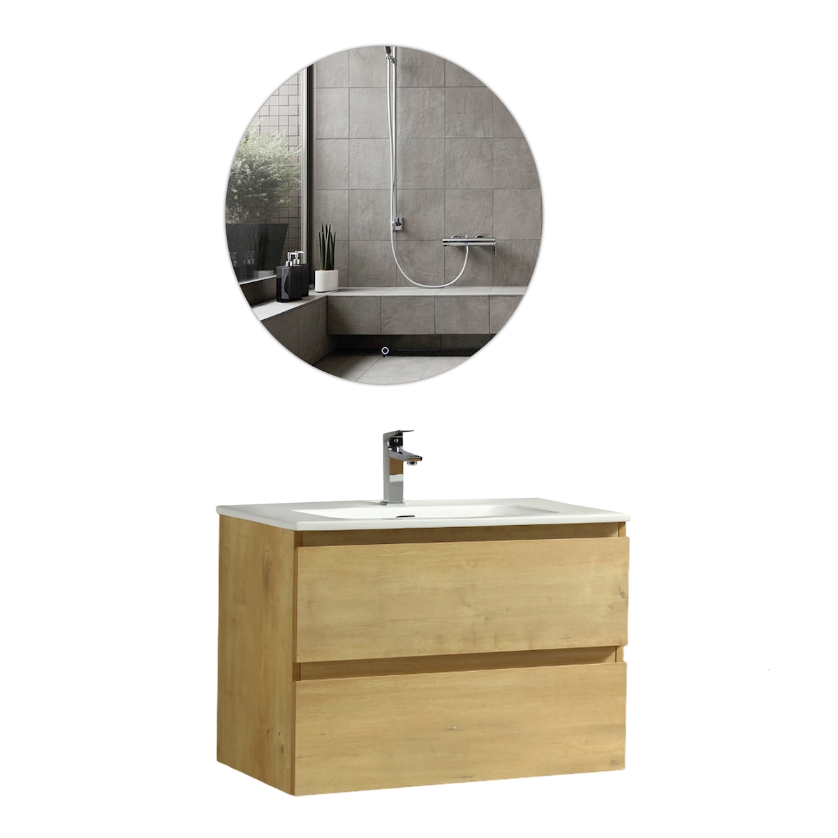 Badmöbel-Set WELLTIME "Hamburg, Badezimmerset 2tlg. Breite 110 cm, Badmöbel, Waschtisch inkl.", weiß (cashmere, eiche cadiz nb), B:110cm H:190cm T:49cm, Holzwerkstoff, Kastenmöbel-Sets, Badmöbel-Set, Waschbecken, Spiegelschrank mit LED Aufbauleuchte, Soft
