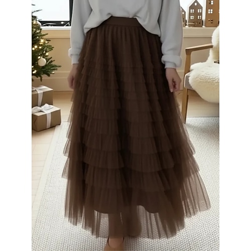 Per donna Linea A Elegante Maxi Misura del girovita medio Gonne Stratificato Inelastico Vinaccia Nero Rosa Marrone Primavera Tulle