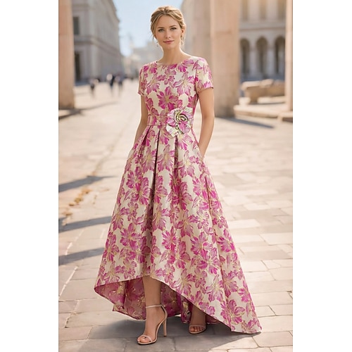 Linea ad A Asimmetrico Lunghezza alla caviglia Abiti da Cocktail Elegante Vintage Floreale Manica Corta Girocollo Festa in giardino Matrimonio Tasca Jacquard con Fiocco/Fiocchi Tasca