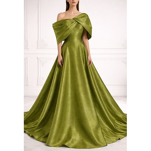 Linea ad A Lunghezza al pavimento Abito da Sera Da principessa Elegante Scintillante Manica Corta Monospalla Matrimonio Formale Tasca Taffetà con Pieghe Tasca