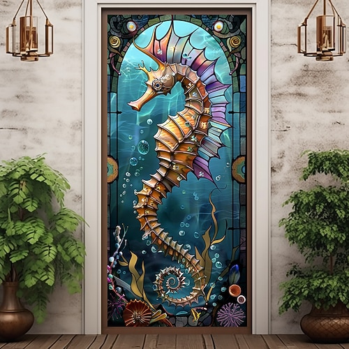 Copriporta in vetro colorato con cavalluccio marino, arazzo per porta, decorazione per tende per porta, fondale per porta, banner per porta d'ingresso, forniture per decorazioni per feste in fattoria