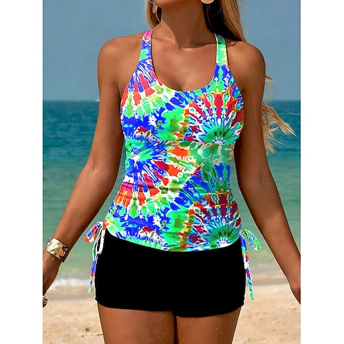 Costume da bagno a due pezzi Tankini da donna con pantaloni corti arricciati senza schienale per vacanze al mare grafica tie-dye scollo a barca senza maniche