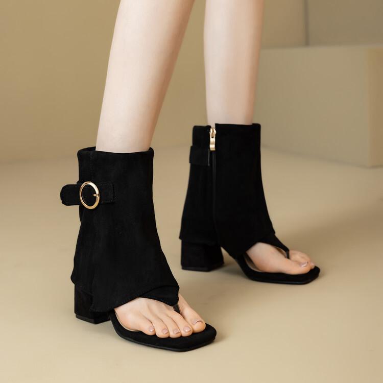 25 French leather black square head belt buckle elastic thin boots 6cm and ankle boots rear zipper thick heel short boots women cm