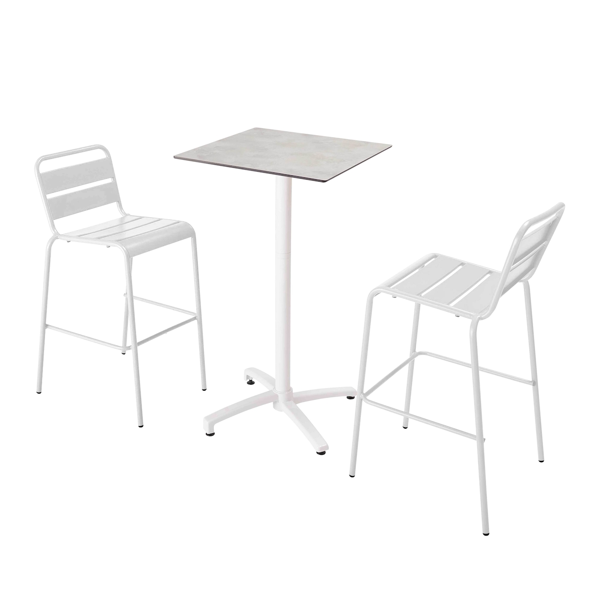 Oviala Business Set Stehtisch aus hellgrauem Betonlaminat und 2 weißen Hochstühlen