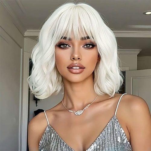 parrucca bianca corta con frangia, lunghezza spalle, carina, caschetto ondulato, riccio, parrucche sintetiche con frangia per donna le ragazze lo usano ogni giorno per le feste cosplay