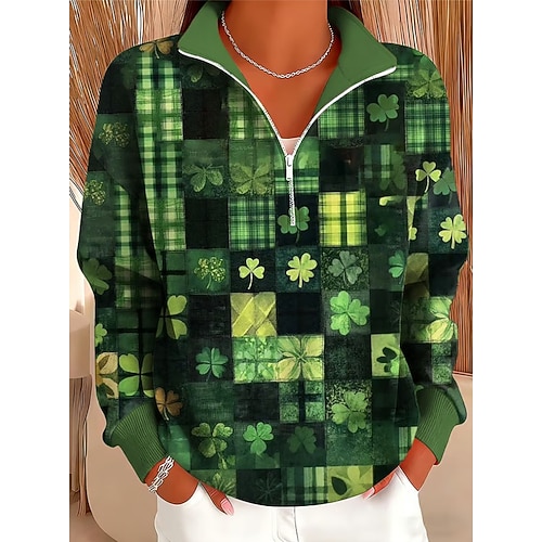 Per donna Felpa Pullover Floreale Grafico Trifoglio Casual Manica Lunga Mezza zip Top Regolari Casuale Abbigliamento Quotidiano Ferie Cerniera Verde scuro Verde Verde militare Primavera Autunno