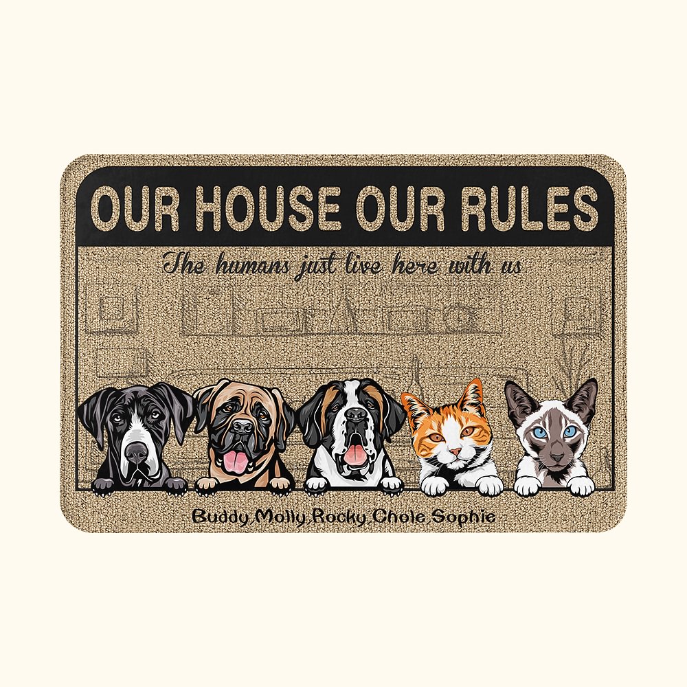 Tapis de porte personnalisé Our House Our Rules The Humans Just Live Here With Us Décoration de maison Anniversaire Noël Cadeau pour propriétaire d'animal de compagnie