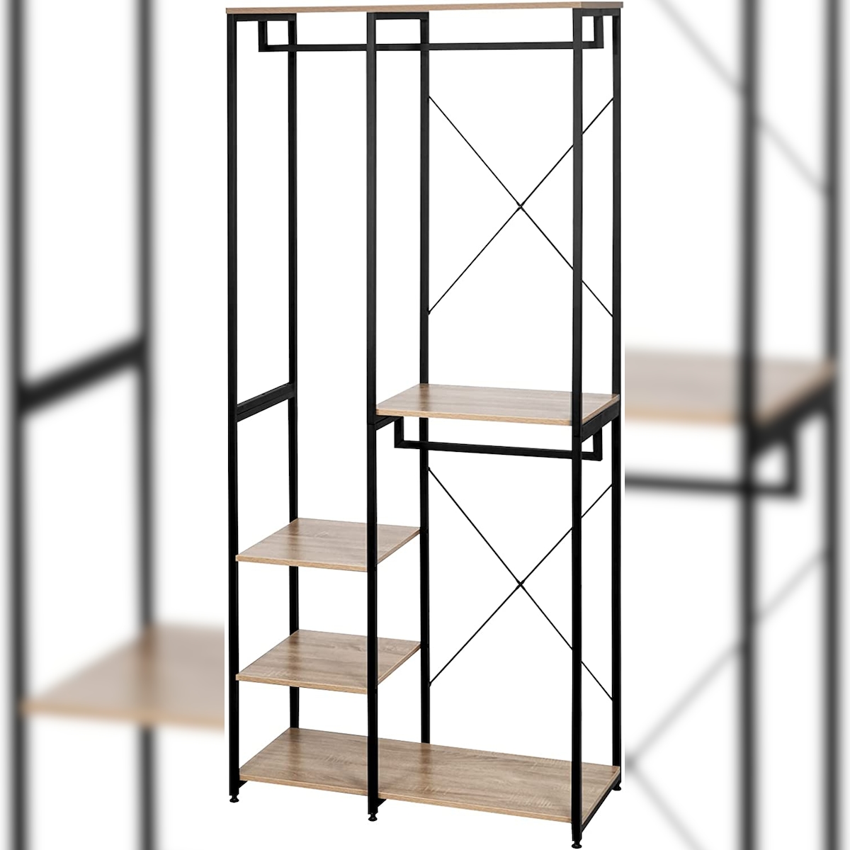 uac Garderobenständer Kleiderständer 204,5 x 90 x 40 cm Hängeregal Wäscheständer mit Kleiderstange und Ablagen Stahl, Hell Eiche