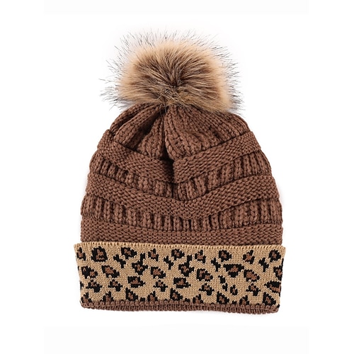 berretto natalizio da donna in maglia con pompon in pelliccia sintetica, caldo berretto invernale con stampa leopardata, elegante accessorio per le feste e per outfit all'aperto