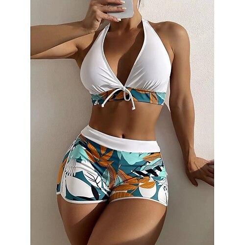 Costume da bagno a due pezzi Bikini da donna Shorts Slim Schiena Nuda Vacanza Mare Abbigliamento Floreale Collo Halter Senza Maniche