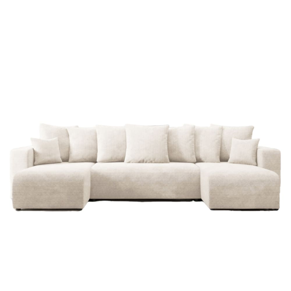 Canapé d’angle panoramique 6 places en tissu anti tâche blanc cassé