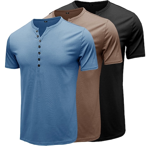 Maglietta da uomo 3 pezzi in misto cotone 80%, manica corta, tinta unita, semplice, con bottoni, stile Henley, casual, per tutti i giorni, estate e primavera maglietta Henley blu e nera per tutte le