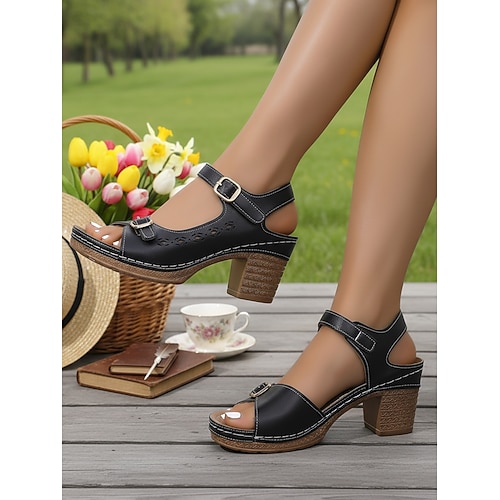 sandali da donna con tacco a blocco e cinturino alla caviglia, sandali aperti per l'uso quotidiano, lavoro, viaggi, feste in giardino e gite estive
