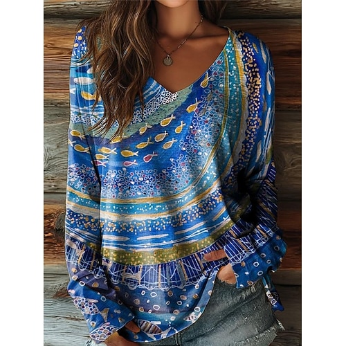 Per donna Maglietta Grafico Geometrico Vintage Elegante Casual Manica Lunga Girocollo Top Regolari Quotidiano Stampato Rosso Blu Reale Viola Verde Primavera Autunno Inverno