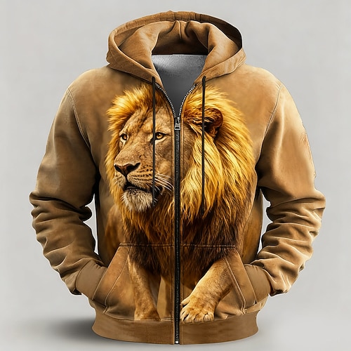 Per uomo Leone Tigre Felpa con Cappuccio Giacca di pelle Felpa Fantasia Stampa su tutta la superficie Con cerniera Vacanza Uscire Abbigliamento casual alla moda Marrone Marrone 2 Marrone 3 Cerniera