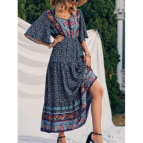 Per donna Abito maxi Abito a trapezio Casual All'aperto Uscire Vestibilità regolare Floreale Manica Corta Scollo a V Blu blu navy Nero Giallo Estate Primavera