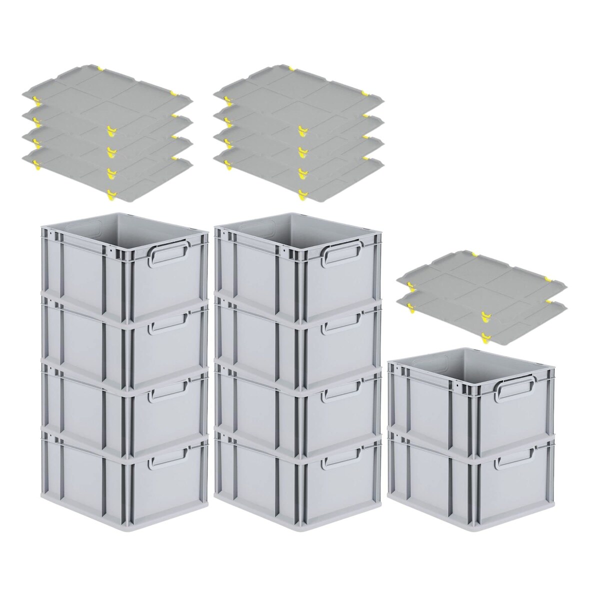 PROREGAL SparSet 10x Eurobox NextGen Economy mit Auflagedeckel & 4x Verschlüsse Gelb, Griffe zu, HxBxT 22x30x40cm, 20L, Eurobehälter, Box