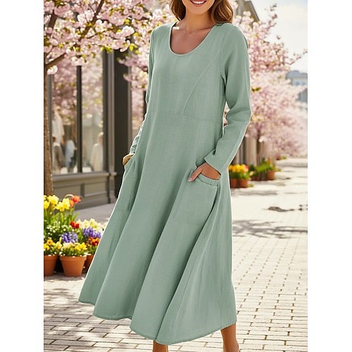 Per donna Abito Midi Abito in cotone e lino Moda Moderno Quotidiano All'aperto Vacanza Vestibilità comoda Semplice Manica Lunga Girocollo Bianco Verde chiaro Rosa Azzurro Estate Primavera Autunno