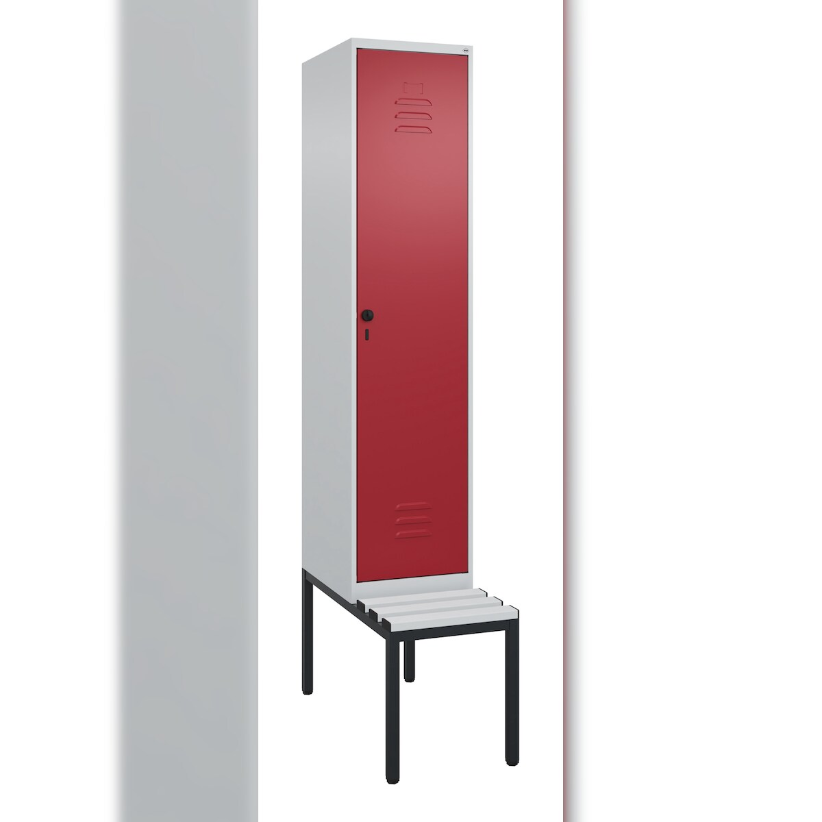 C+P Spind Classic PLUS, Kunststoff untergebaute Sitzbank, 1 Abteil, HxBxT 212x40x82cm, Sicherheitsdrehriegel, Hellgrau/Rubinrot von PROREGAL