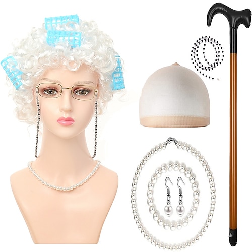 parrucca da vecchia signora con bigodini, collana di perle, orecchini, set di bastoni per donne e ragazze, costume da nonna per cosplay, accessori per feste di Halloween.