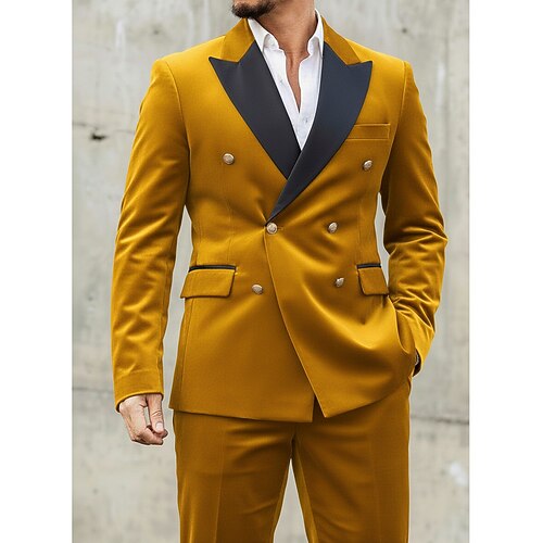 Abiti casual da uomo in velluto per feste, con revers a lancia, giallo rosso, tinta unita, vestibilità standard, 2 pezzi, doppiopetto, sei bottoni