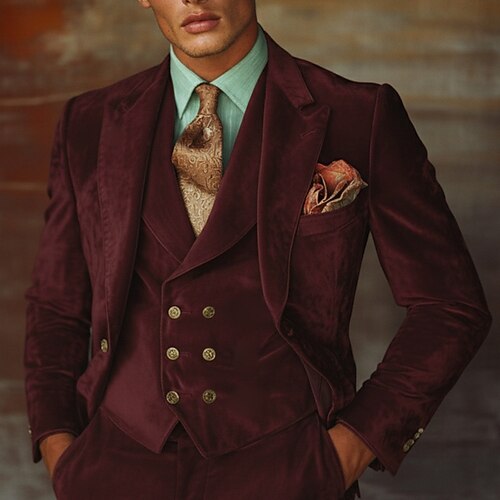Uomo Affari Casuale Abito di velluto Bavero a lancia Borgogna Quotidiano Affari Tinta unita Vestibilità su misura 3 pezzi Monopetto a un bottone