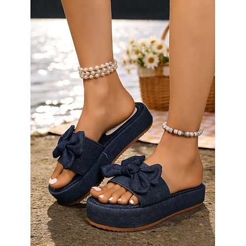 sandali con plateau e fiocco in denim da donna, design alla moda con punta aperta per le vacanze, le passeggiate in spiaggia, lo shopping e l'abbigliamento casual estivo