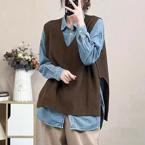 Per donna Felpa Maglione Vintage Streetwear Casual Tinta unica Scollo a V Bottoni Lavorato a maglia Senza Maniche Top Regolari Maglia Quotidiano Ferie Uscire Nero Giallo Primavera Autunno
