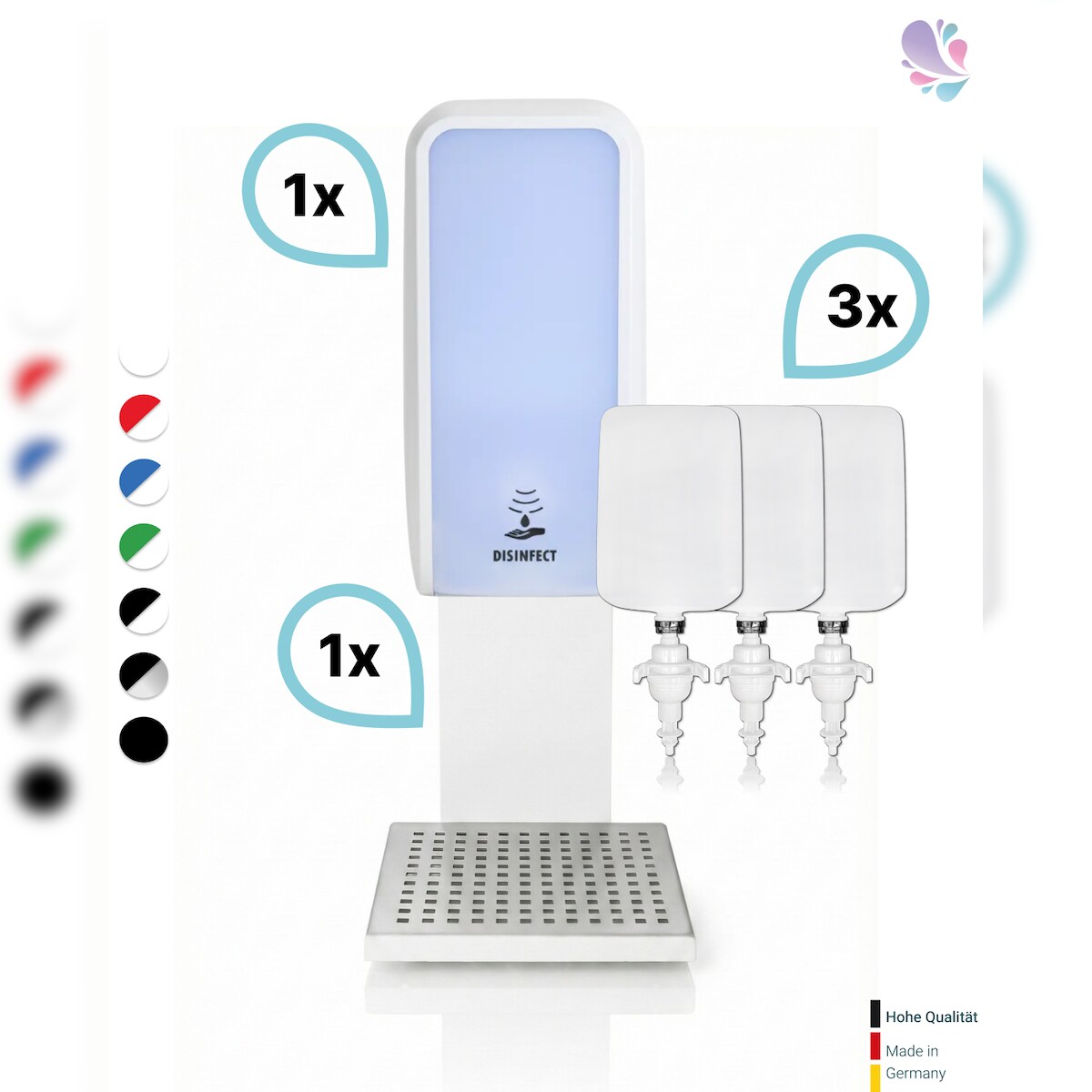 Blanc HYGIENIC SET: Desinfektionsspender SENSOR Blanc Cosmos versch. Farben + Tischständer weiß +3x 1-Liter Hautdesinfektion : Farbe - Weiß