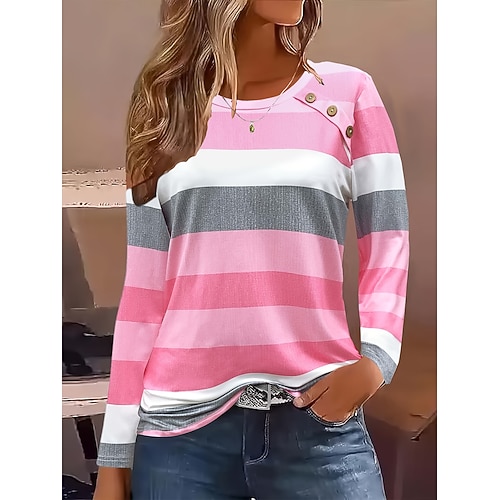 Per donna Maglietta Grafico A righe Vintage Elegante Classico Manica Lunga Girocollo Top Regolari Quotidiano Uscire Weekend Bottoni Stampato Rosa Primavera Autunno Inverno