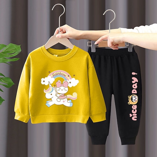 2 Pezzi Bambini Ragazze Arcobaleno Girocollo Set Felpa con cappuccio Pantaloni della tuta Impostato Manica Lunga Attivo All'aperto Cotone 3-7 Anni Primavera Maglione unicorno nero bei pantaloni
