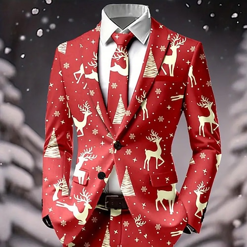 Per uomo Blazer Cappotto Natale Vacanza Casuale Casual Quotidiano Casual Autunno / Inverno 100% Poliestere Fiocco di neve Stampa 3D Bottoni Calore Termico Confortevole Monopetto Giacca Rosso 1 Rosso