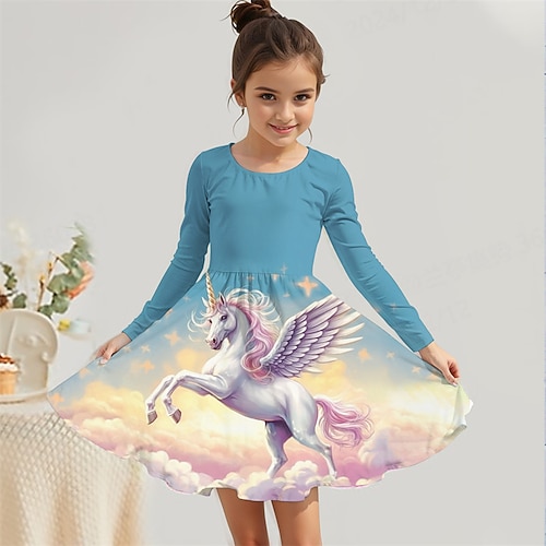 ragazze' 3D Pop art Unicorno Vestito Manica lunga Estate Primavera Da mare Giornaliero Per eventi Da principessa Bellissimo Dolce Bambino 4-12 anni Abito casual Abito linea A Al ginocchio Standard