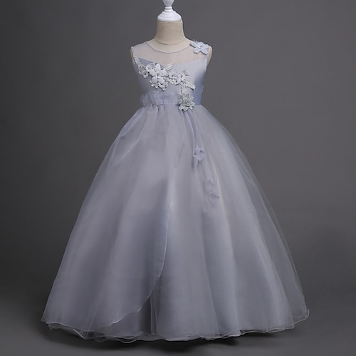 Abito da damigella d'onore bambina Ragazze Abito formale Abiti da sposa Feste Matrimonio Formale Elegante Moda Dolce Abito per la Prima Comunione Pizzo Rete Floreale Senza Maniche Girocollo Grigio