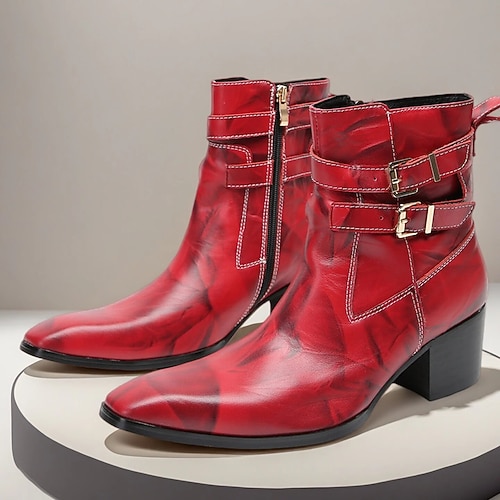stivaletti da uomo in pelle rossa con doppia fibbia – tacco a blocco alla moda con design elegante, perfetti per le riunioni di Natale e le celebrazioni delle festività con un'atmosfera natalizia