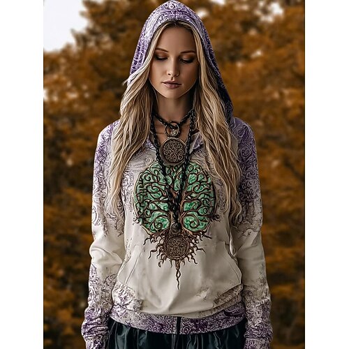Per donna Felpa con cappuccio Tribale Vintage Casual Manica Lunga Con Cappuccio Top Regolari Casuale Sportivo Viola Cachi Beige Primavera Autunno Inverno
