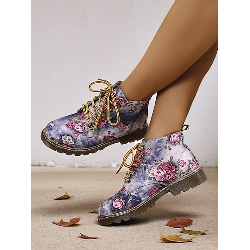 stivaletti da donna con lacci floreali e suola antiscivolo, scarpe casual in stile combattimento con stampa vintage per comode passeggiate all'aperto abbigliamento quotidiano