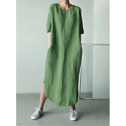 vestito midi da donna in cotone e lino, vestito a trapezio, vestito estivo, casual, da vacanza, quotidiano, vestibilità ampia, tinta unita, mezza manica, girocollo, azzurro, nero, bianco, verde,