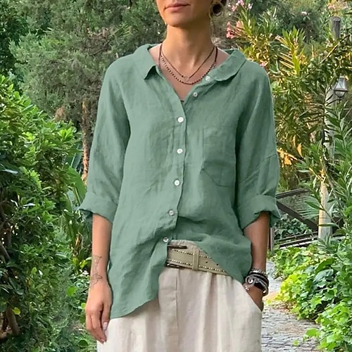 Per donna Camicie di cotone e lino Tinta unica Essenziale Casual Manica 3/4 Girocollo Top Regolari Quotidiano Ricamato Bottoni Rosa Blu Albicocca Estate