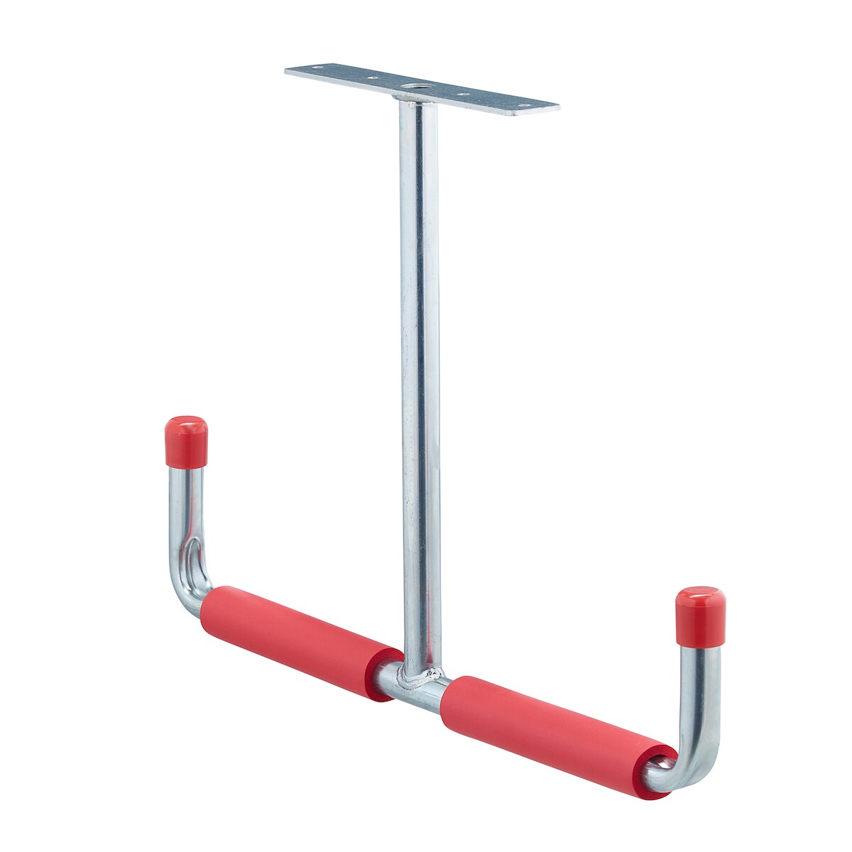 Relaxdays Deckenhaken Garage, T-Profil, bis 25 kg, für Stauraumbrücke, Stahl mit Polsterung, HxB: 30 x 42 cm, silber-rot