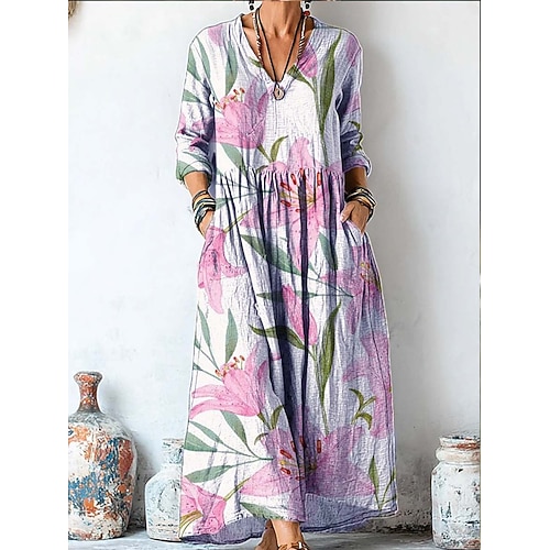 Per donna Abito maxi Vestito Estivo Abito Pieghettato Vacanza Casual Boho Uscire Spiaggia Vestibilità comoda Floreale Grafico Paisley Manica Lunga Scollo a V Rosa Viola Verde Estate Primavera Autunno