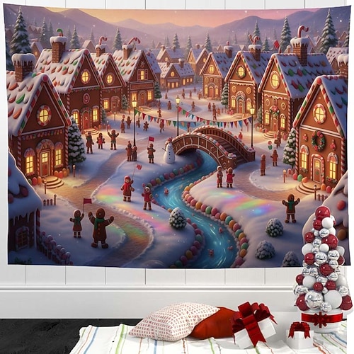 Arazzo natalizio con scena innevata – arazzo da parete con paesaggio invernale da favola, arazzo decorativo con motivo di albero di Natale e paesaggio forestale con fiocchi di neve per la casa, la