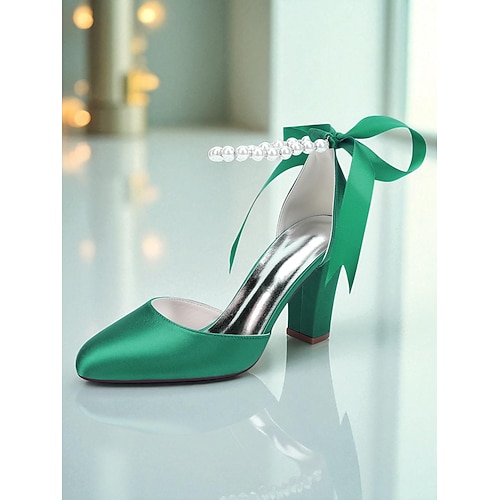 Scarpe con tacco da damigella d'onore per donna: scarpe con tacco a blocco e cinturino alla caviglia in perle color champagne, eleganti décolleté in raso per feste nuziali e occasioni formali