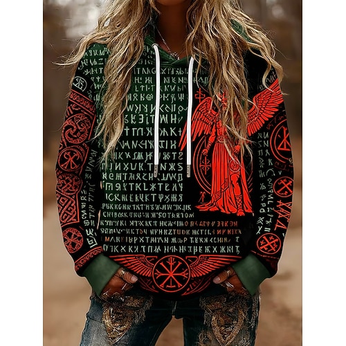 Felpe con cappuccio da donna in stile vichingo, grafiche, vintage, casual, a maniche lunghe, con cappuccio, normali, da indossare tutti i giorni, casual, sportive, con coulisse, tasca, stampa, verde,
