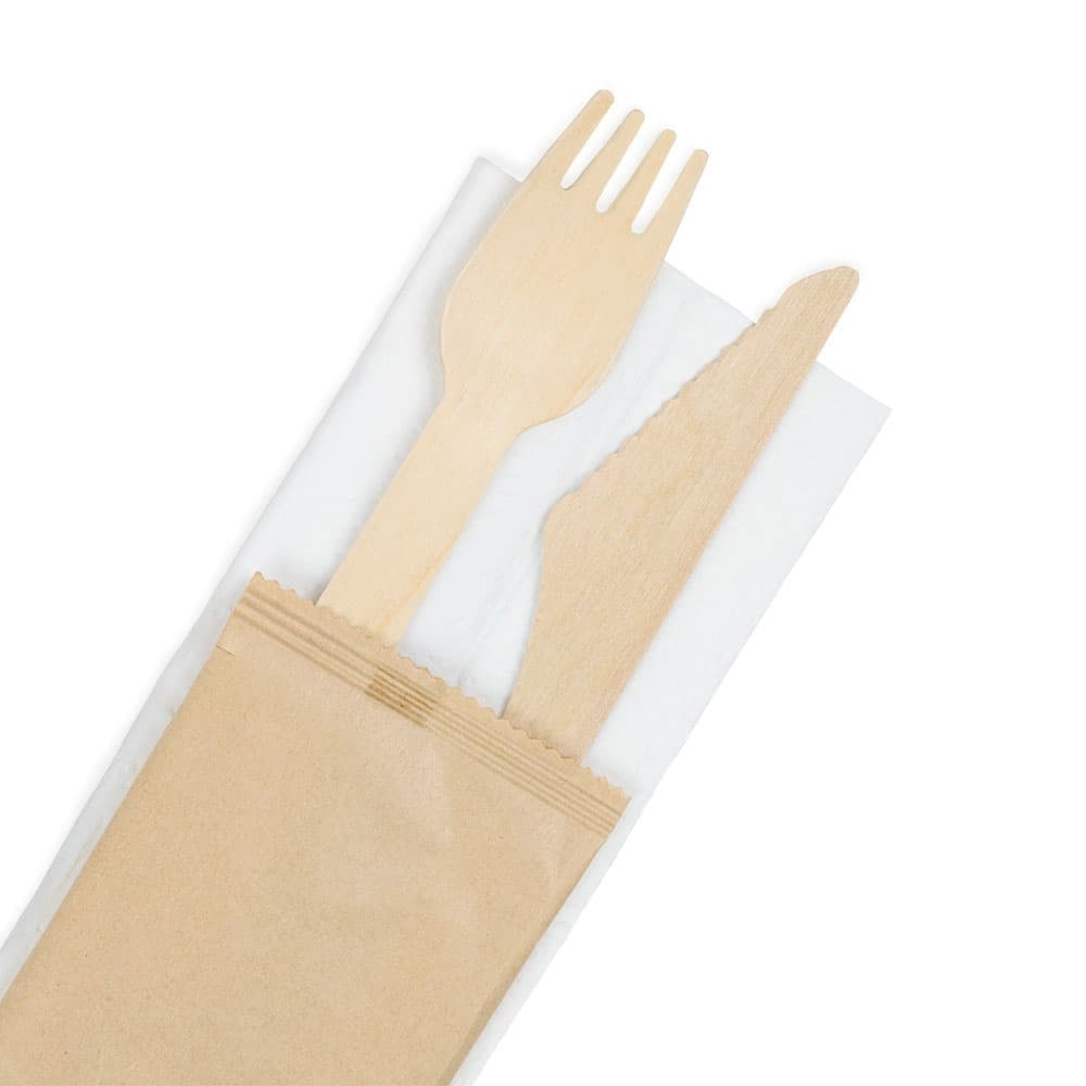 BIOZOYG 200 Stück Einweg-Besteck-Set Partybesteck, Biobesteck, kompostierbar, Holzbesteck Einwegmesser Einweggabeln und Serviette aus Recyclingpapier